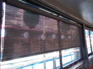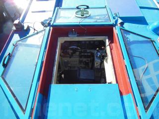 操船席ハウスは写真の通り、寒い日の走行時でも快適な空間になっています。低い橋などを通行する時には上部が写真の通りに可倒式になっています。