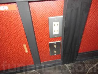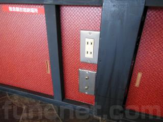 窓には日よけの為にロールカーテンがあります。また、壁側には6個のコンセントとカラオケ用のマイクジャックがあります。