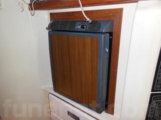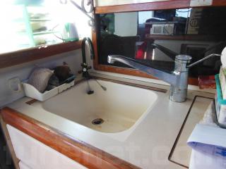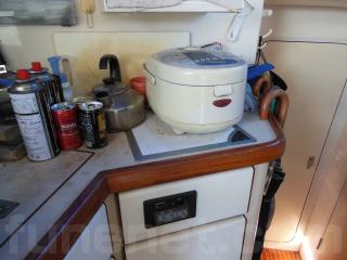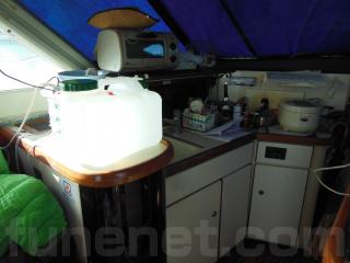右舷側にはLS操船席、左舷側にはギャレーがあります。ギャレーにはシンクや冷蔵庫、電子レンジなどの装備があります。