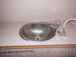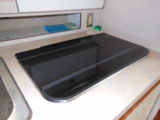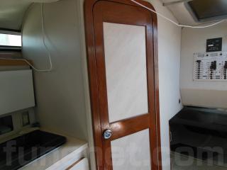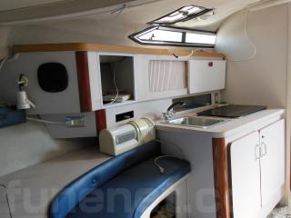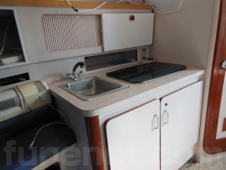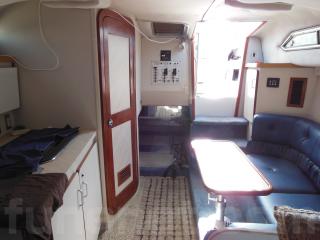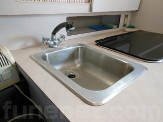 キャビン入口を入るとまず左舷側に大きなソファーとテーブルがあり、とても広い空間が確保されています。右舷側にはギャレーがあります。ギャレーにはシンク、電気コンロ、冷蔵庫等の装備がされています。また、電動トイレやシャワーの設備もあります。キャビン入口の右下にはアフトキャビンがあります。大人2人が横になることが出来る空間が確保されています。