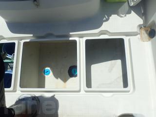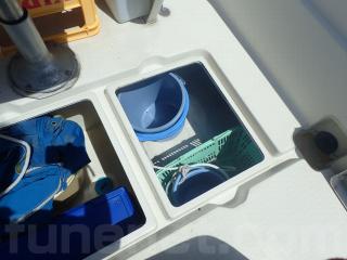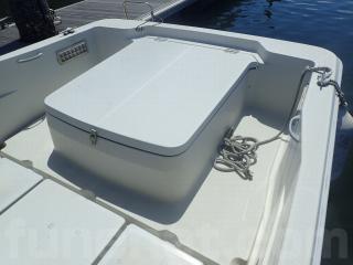 ・操船席後ろのハッチは、収納スペース用とイケスがあります。イケス船底部分のスルハル部分に多めにコーキングが塗られていますが、上架した際に、一度、取り付けをやり直しすれば、漏れの問題ないようです。