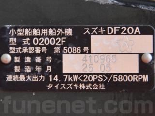 ◆船外機はスズキ製4サイクルDF20A(型式:02002F、連続最大出力:20PS/5,800rpm)を搭載しています。なお、この船外機は始動がセル&リコイルスターターでチルトは電動です。また20馬力ながらフューエルインジェクション・リーンバーンで燃費も良いと思われます。