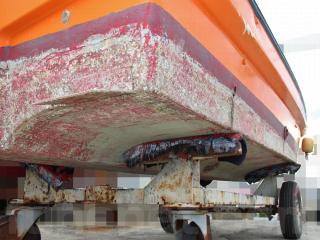 ◆船体はオレンジに塗装されて本来の船体色は不明ですが、航行に影響があるような大きな損傷などは無いように見受けられました。また、現在は陸上に揚げて保管されていますので、取材時には船底の写真も撮影させていただきましたが、こちらも航行に影響があるような大きな損傷などは無い様に見受けられました。なお、現在も陸上保管されていますので、船底の様子も確認可能です。