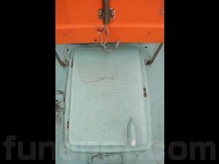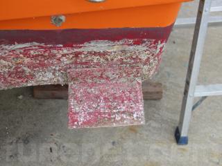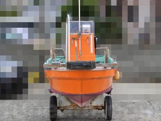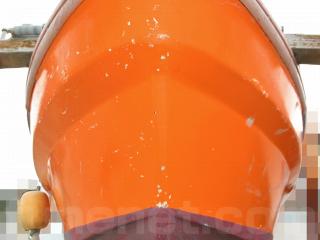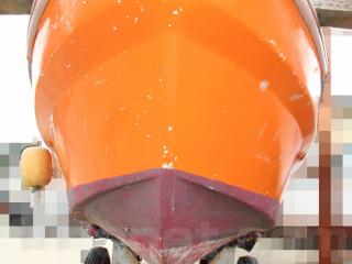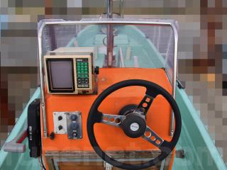 ◆昭和に進水した艇ですが、船外機は平成25年製造のスズキ4サイクル船外機を搭載し、操舵はワイヤー式のヘルムハンドル化されています。船体はオレンジに塗装されて本来の船体色は不明ですが、航行に影響があるような大きな損傷などは無いように見受けられました。また、現在は陸上に揚げて保管されていますので、取材時には船底の写真も撮影させていただきましたが、こちらも航行に影響があるような大きな損傷などは無い様に見受けられました。なお、現在も陸上保管されていますので、船底の様子も確認可能です。