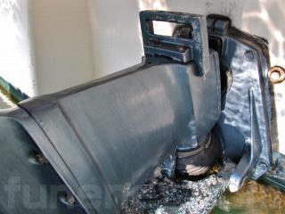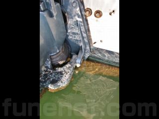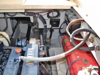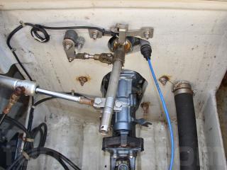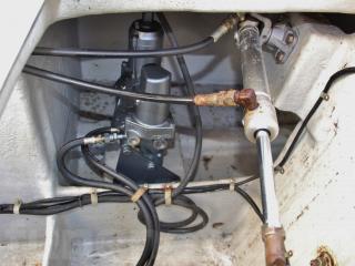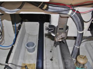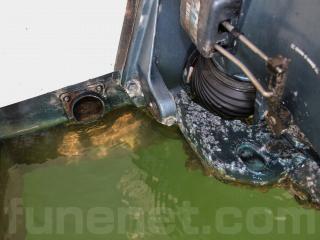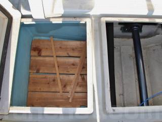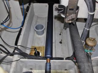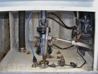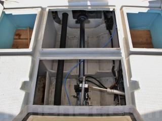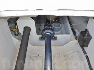 ◆アフトデッキ(トモ)の最後尾サブタを開けるとドライブのチルトモーターや油圧操舵部が見えます。外観上はオイル漏れなど無く特に問題は無いように見受けられました。
