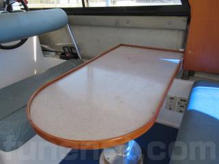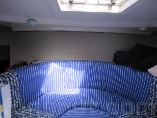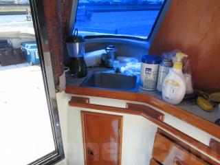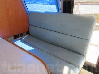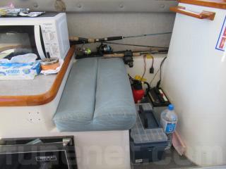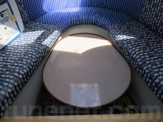 メインキャビンには右舷側にテーブルとソファがあります。左舷側にはギャレーとソファが装備されています。ギャレーには冷蔵庫、電子レンジ等があります。