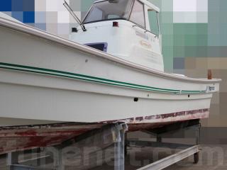 ◆平成11年進水の艇です。船体のゲルコートは船齢なりの日焼けなどによる経年劣化は見受けられます。またハルはオモテの両舷に係留時についたと思われる擦り傷やゲルコートが剥げたようなアテ傷がありますが、補修され、また、内部のFRPが割れるような重篤な傷ではありませんので、航行には影響が無いと思われます。