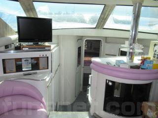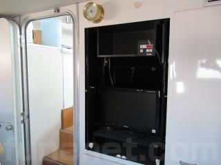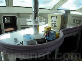 入口を入りますとまずメインキャビンになります。両舷に大きなソファーや1つのテーブルの装備があります。TV、DVDプレーヤー、ステレオなどがあります。