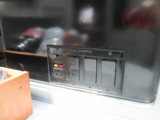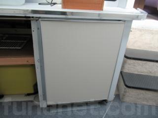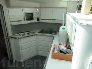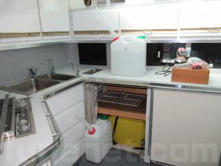 前方に進むと、階段を降りた右舷側にはギャレーがあります。ギャレーにはシンク、冷蔵庫、電気コンロ、電子レンジなどがあります。