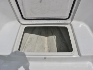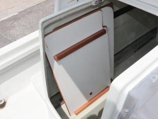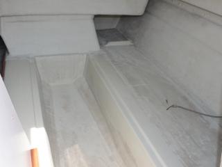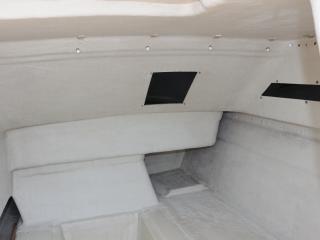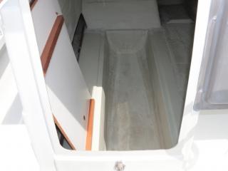 ◆キャビンスペース内も綺麗に掃除されています。ここにはヘルムハンドルの左側にあるハッチから入れます。内部は大人が数人入れる広さがありますので、それなりに長いワンピースロッドや大きめのクーラーボックスなども入りそうです。また、マリントイレの取り付けも可能だと思われます。