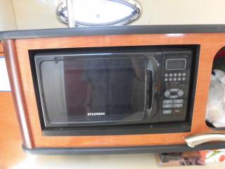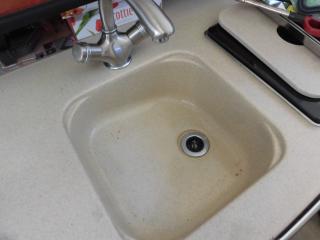 階段を降りて左舷側にはシンク・冷蔵庫・コンロ・電子レンジがあります。