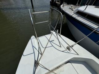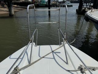 船首についているレール部分の棒が取り外しできますので、船首からの乗り降りも楽ちんですし、釣りも安心して楽しむことが可能です。