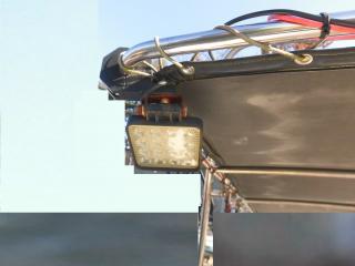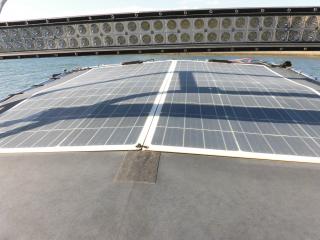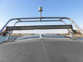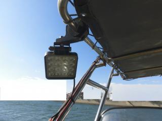 オーニングの上には大型のサーチライトとソーラーパネルがあります。