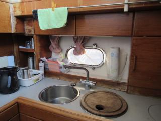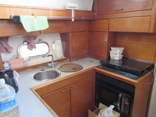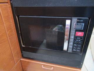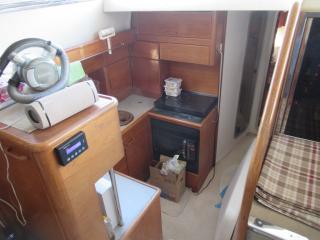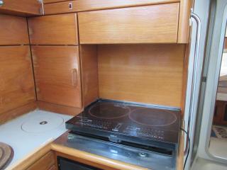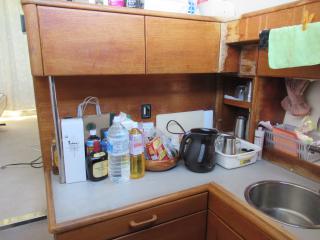 まず入口を入るとまずメインキャビンになります。右舷側にはテーブルと大きなソファーがあります。また、左舷側にもソファーがあります。写真のようにメインキャビンの前方にはTVが装備されています。右舷側がLSの操船席になります。階段を降りると、左舷側にはギャレーがあります。ギャレーには冷蔵庫、シンク、電子レンジや電気コンロなどが装備されています。