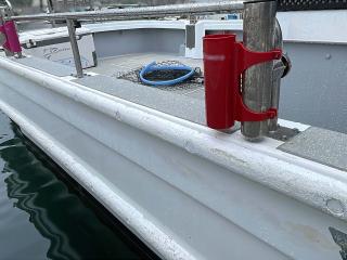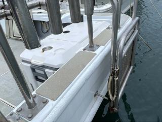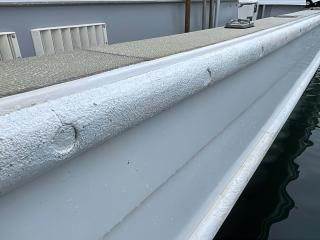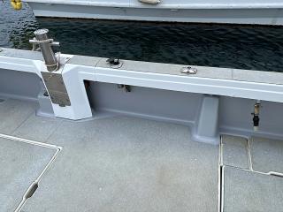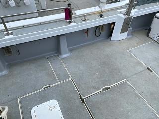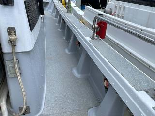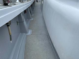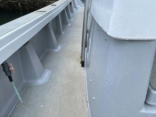 サイドウォークは広め。内側まで光沢があります。海水デッキホース蛇口が各所にセットされています。