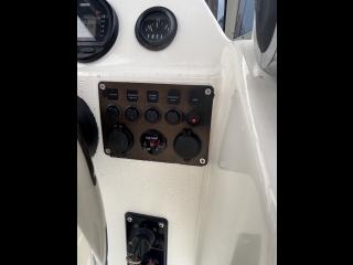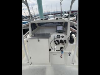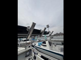 今流行のTトップオーニングにロッドホルダー、バウ側とスタン側に高めのレールが装備されており使いやすい艇です。
