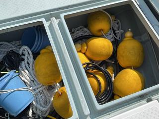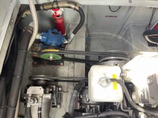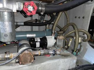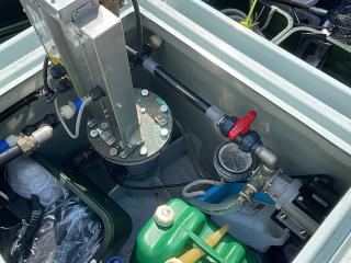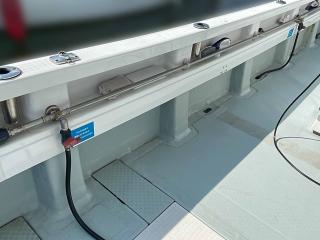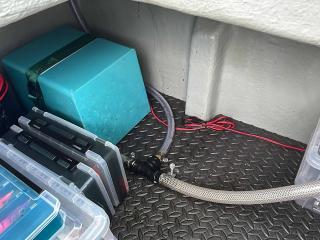 循環海水ホースはモーターポンプかヒューガルで作動。普段はモーターを使用しますが、エアコンなどを使用中で電力が足らない時などは、生け簀に水を張ってヒューガルポンプに切り替えて汲み上げたりもできる。