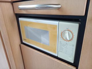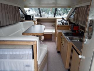 キャビン入口を入るとまず左舷側に大きなソファーとテーブルがあり、とても広い空間が確保されています。右舷側にはギャレーがあります。ギャレーにはシンク、電子レンジ、電気コンロ、冷蔵庫等の装備がされています。