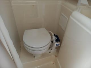 そのまま前方に進みますと右舷側にはトイレルームがあり、手動式トイレの装備があります。