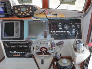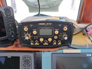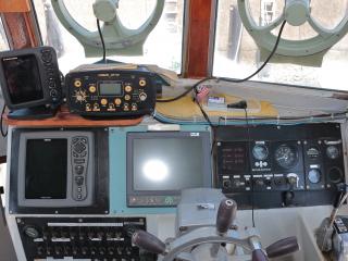 ◆ブリッジには両舷とアフトデッキからアクセス可能です。操船部にはレーダー、GPS魚探、魚探、オートパイロットなどが備わっています。また、1W漁業無線も装備しています。