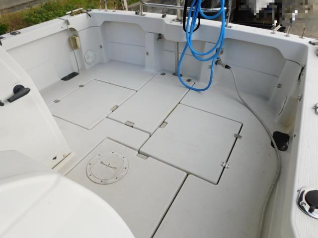 デッキ床面にはイケスの他にストレージも充実しており、電動リール端子、100V電源、海水デッキウォッシャーなどのフィッシングに必要な装備が、トランサムにはスパンカー(ナカセン)、トランサムデッキ、スイムラダーも装備しております.