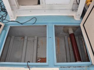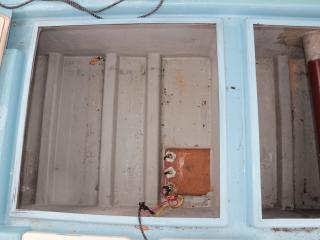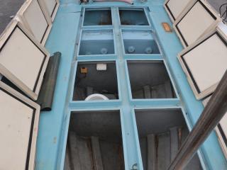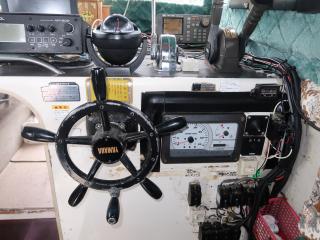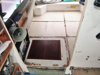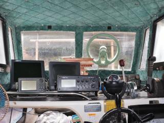 ◆操船部には後方スライドドアからのみアクセス可能です。操船部にはGPSプロッター魚探、GPSナビゲーター、オートパイロットなどが備わっています。また、漁業無線も装備していますが、現状では漁船登録を抹消していますので法的には現在使用できません。なお、この船を漁業者さんが購入されて漁船登録をされた場合、この無線機が改めて開局できるかどうかは不明です。(総務省に問い合わせてスプリアスの確認が必要です。必要でございましたら当方にお申し付け下さい。)