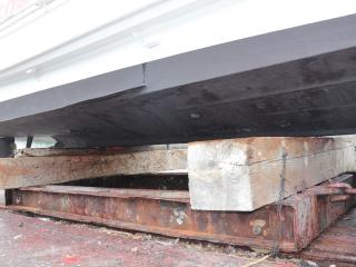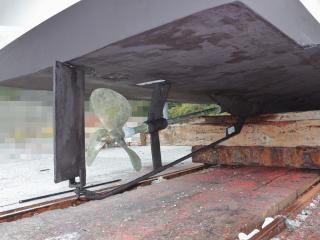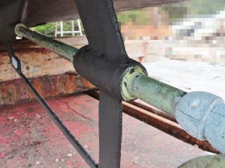 ◆この船は現在係留保管されていますが、取材時は上架状態でしたので船底の写真も撮影できました。なお、シャフトはブラケット保持でシューピース付きです。また、シャフトはSUS630でΦ55mmです。
