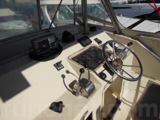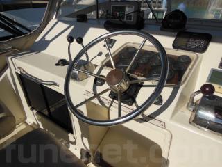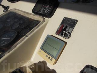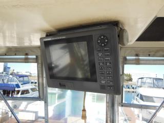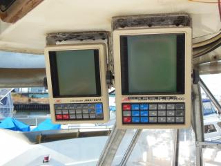 操船席にはコンパス、GPS魚探(FURUNO)、レーダー(JRC)、スラスター、オートパイロット、オートアンカー、フラップコントロール等が装備されています。