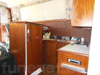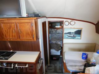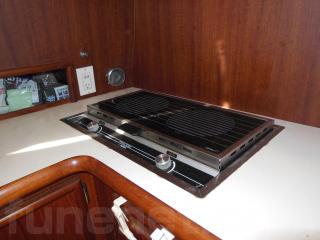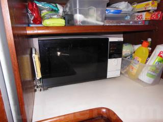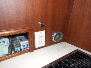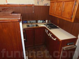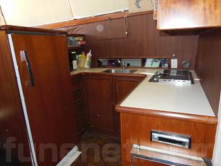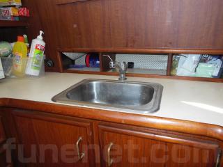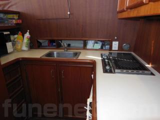 そのまま進み、階段を降りると左舷側にはギャレーがあります。ギャレーにはシンク、電子レンジ、冷蔵庫、電気コンロなどの装備があります。