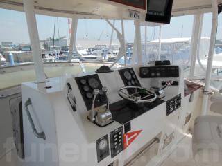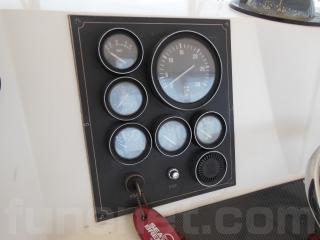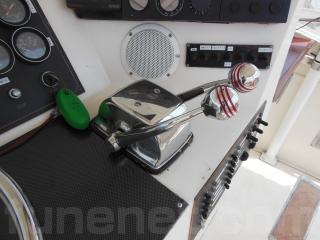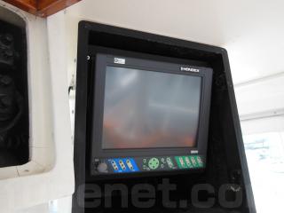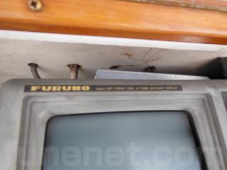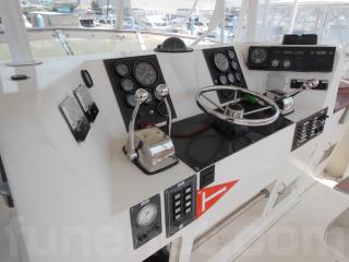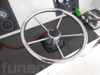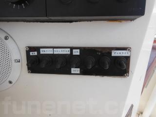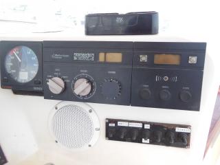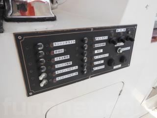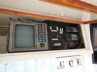 操船席にはコンパス、GPS魚探(HONDEX HE-101GP-Di)、レーダー(FURUNO)、マリンVHF、オートパイロット、フラップコントロール等が装備されています。