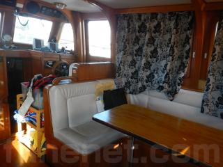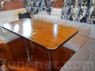 まず入口を入るとセンターキャビンになります。右舷側にはテーブルが装備されており、ゆっくりとくつろげる事が出来るソファーがあります。