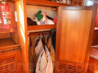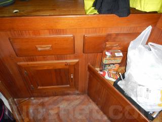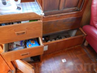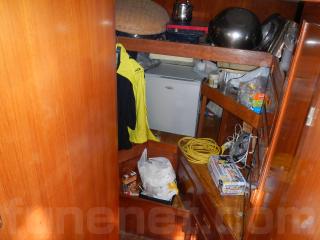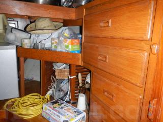 船首側に進みますと広い倉庫になっており、小物から大きなものまで収納することが出来ます。左舷後方には、シンクスペースもあり、洗い物などのギャレーとしても十分使える広さです。