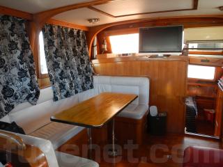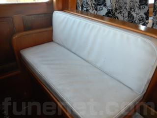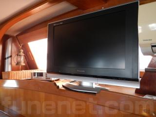右舷側ソファーの前方が操船席になり、センターキャビンには家庭用エアコン、TV、などの装備があります。