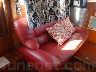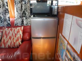 左舷側には赤いソファーがあり、大勢でテーブルを囲むことが出来ます。その横には、電子レンジ、冷蔵庫などが装備されています。