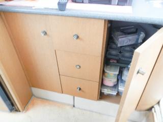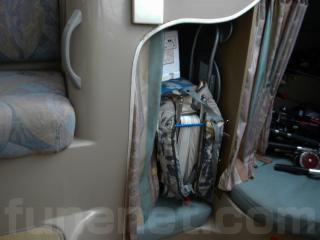 前方バースはカーテンで仕切られており、ちょっとしたプライベート感もあります。写真にある釣具は売却時には降ろしますので付属していません。
