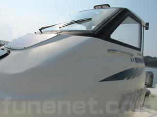 『フィッシングメイト23カディ』は、和船船型を採り入れました高性能な船型を採用しています。この船型は、比較的大きな(強い)船首船底のV型状と、船尾船底のフラットなキール形状の効果で、波の中での走りやすさと停泊時の静止安定性を高い次元で両立させているのが特徴です。揺れが少なく、アンカーを入れての釣り、ロッドを振るってのルアー釣りには最適のボートです。