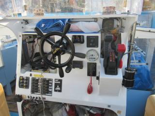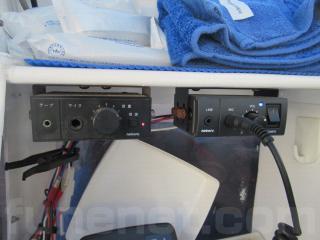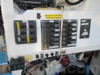 操船席にはGPS魚探(HONDEX)、船内・船外用マイク、スラスター、インバーター(1800W)、電動リール電源等が装備されています。