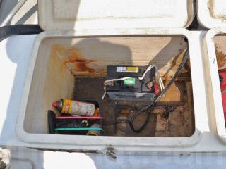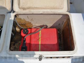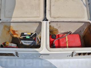 ◆トランサム側のサブタを開けるとガソリンタンクとバッテリーが現れます。なお、タンク容量は24リッターです。バッテリーは2019年6月に交換されたそうです。
