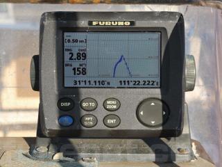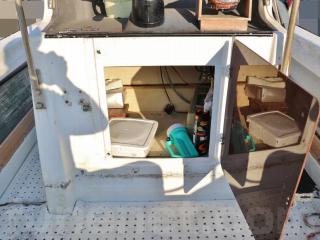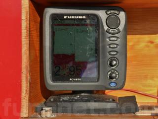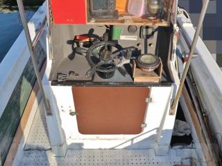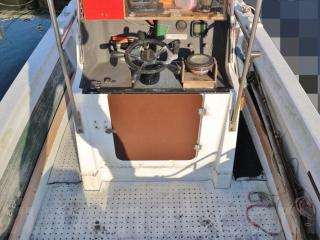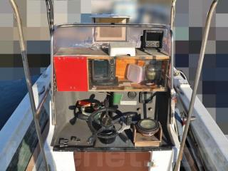 ◆この艇はセンターにコンソールがあり、ヘルムはそこに有ります。また、操舵は油圧式です。センターコンソールにはオーニングがあり、古野製のGPS航法装置と魚探が備わっており、取材時には動作確認を致しました。どちらも小型ですが、GPSと魚探がそれぞれが独立した画面で見る事ができるので、釣行時の使い勝手は良さそうです。(掲載している画像は緯度経度の数値を編集してあります。)また、ヘルムハンドル下にもストレージがありますので、ここも重宝しそうです。
