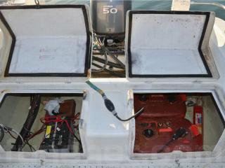 ◆この艇の特徴としてバウに大きなストレージがありますので20フィートのボートとしては収納力があります。大人が中に入れるほどの広さがありますので、艇に釣り具や道具を置いて帰りたい方や、濡らしたくない物を運ばれるのには便利です。また、バウには電動アンカーウィンチが装備されています。
