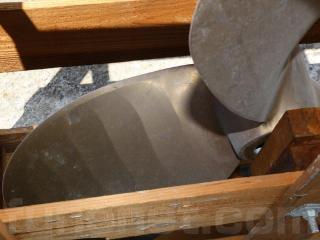 ◆取材時は木枠に梱包されたまま撮影致しました。三枚翼で適合シャフト径はΦ85mmです。なお、刻印によりますと、ダイヤ(D)は960mm、ピッチ(P)は1000mmのようです。