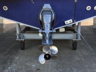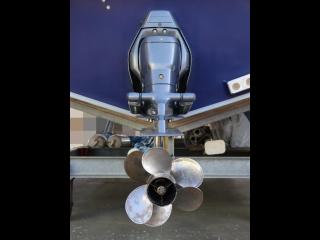 ◆アフトドライブはヤマハ製SXの二重反転プロペラが装備されているモデルで効率が良く、コモンレールエンジンと相まって燃費や船速もシングルプロペラモデルよりも良いと思われます。また、二重反転の為、プロペラの回転トルクが相殺されて航行時の艇の傾きも抑えられているでしょう。取材時は油圧ホース、パッキン類からのオイル漏れなどは無いように見受けられ、キャビテーションプレート、プロペラも問題無いように見受けられました。