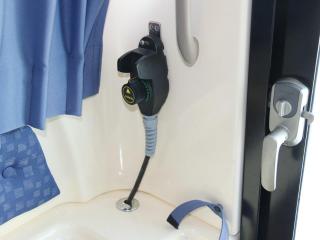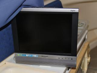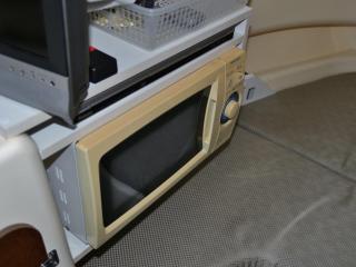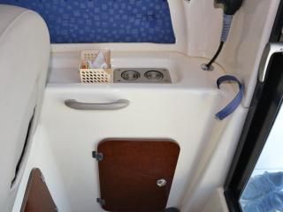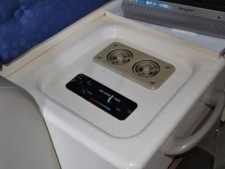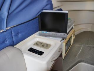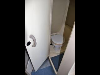 ◆コクピット左舷側にはエアコンのコントロールスイッチ&吹き出しがあります。エアコンはよく効くとの事でした。またその奥には液晶テレビ&DVDプレイヤー、電子レンジなどが備わっており、コクピットの前が個室トイレになっています。個室トイレの状態も良好でした。