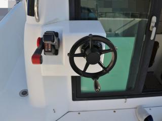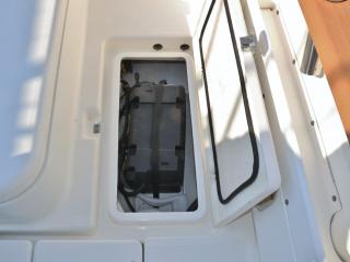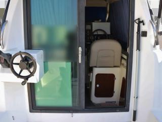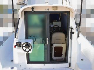 ◆アフトデッキ、リアドア後ろ左舷側にはセカンドステーションが備わっており、コクピットのGPS魚探をここに移設すれば、ここでも快適な操船が可能です。また舵リモコンも備わっていますので右舷側でも操舵可能です。