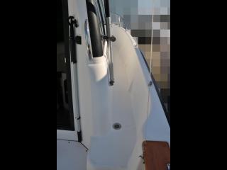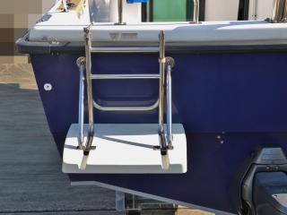 ◆ブリッジ両舷にはアウトリガーも装備しています。また、フロントガラスカバーも付属しています。また、左舷トランサムにはステップとラダーが艤装されていますので、海上へのアクセスも良好です。