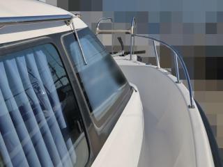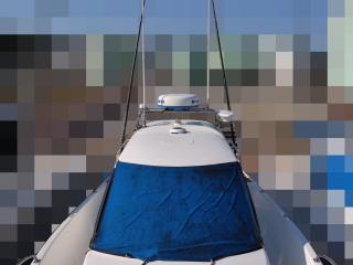 ◆バウには電動アンカーウィンチが装備され、アンカーは2本付属します。また、フロントウィンドウカバーも付属します。ルーフの上にはしっかりしたステンレスのレーダーアーチが備わっており、レーダーアンテナ、サテライトコンパスアンテナ、GPSアンテナなどが取り付けられています。