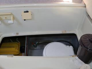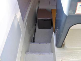 ◆操船部の左舷側から階段より下階層のキャビンスペースにアクセスできます。ここには電動マリントイレが備わっています。