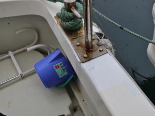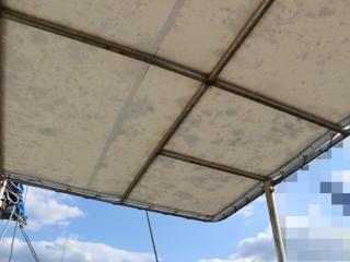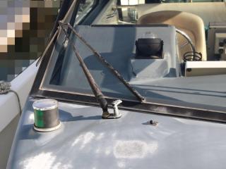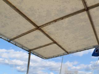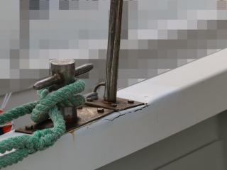 ◆デッキは硬くブアついた所は無いように見受けられました。バウやブルワークには船齢相応の傷や日焼けなどがありますが、たちまち航行に大きく影響があるような損傷は無いように見受けられましたが、アフトデッキ、左舷ブルワークのオーニングフレームが当てによる影響で少し曲がっています。(写真NO,43~46)
