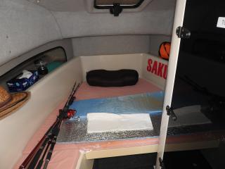 ◆バウバースは広く2人は休息できるスペースです、右舷側に個室の手動式トイレが有ります。