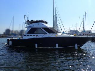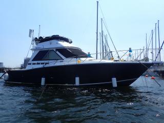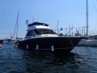ご紹介の船は、ヤマハPC‐35です。クルージングやフィッシングの機能に加え、船内でのお泊りや居住性がありますので、仲間たちやご家族で楽しめる大変人気の高い艇種です。
